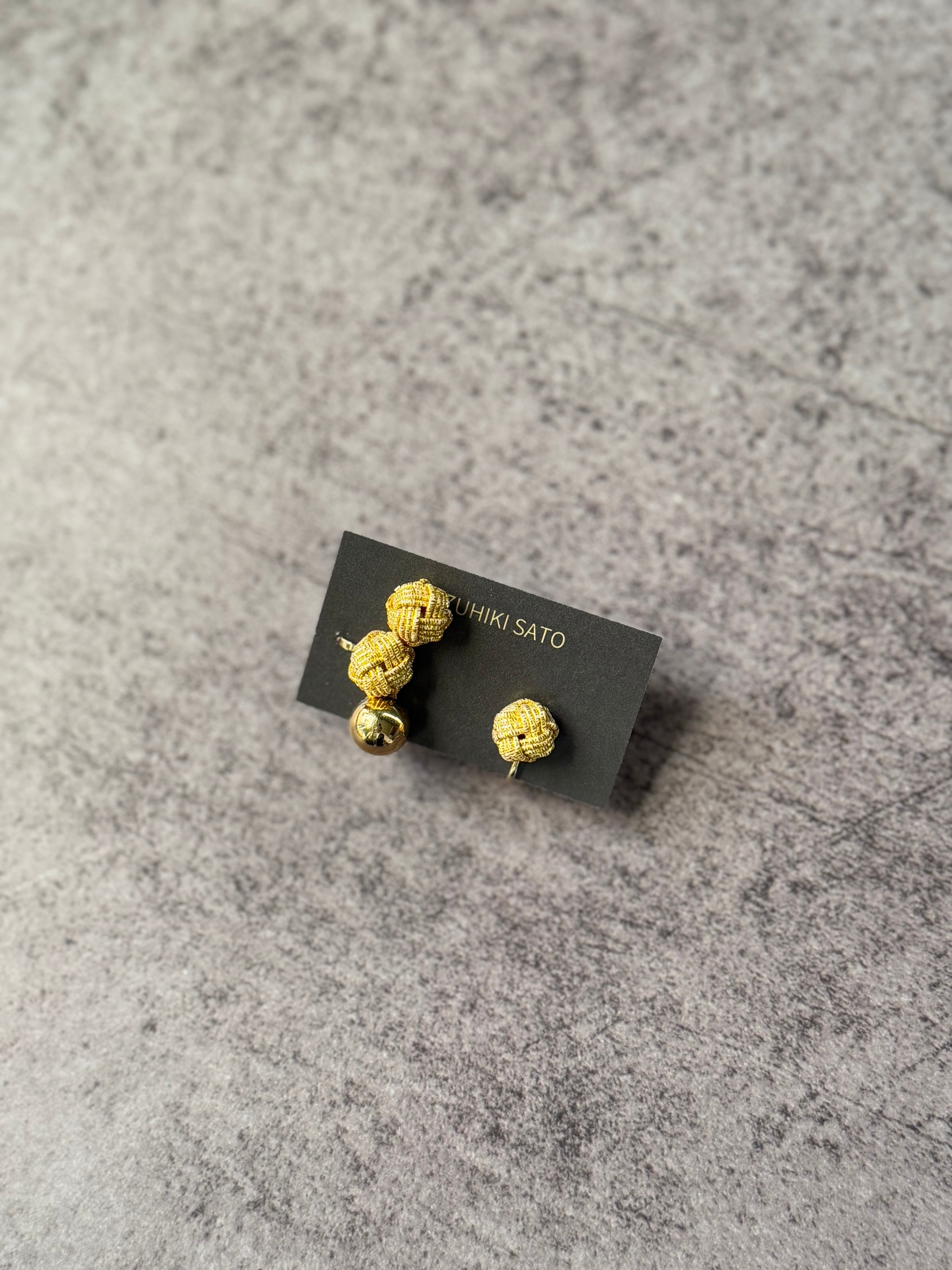 パールの丸さと,淡路玉の丸い形を利用して耳のラインに寄り添うきれいな流れを作りました。メタリックゴールドのボールがアクセントになっています。