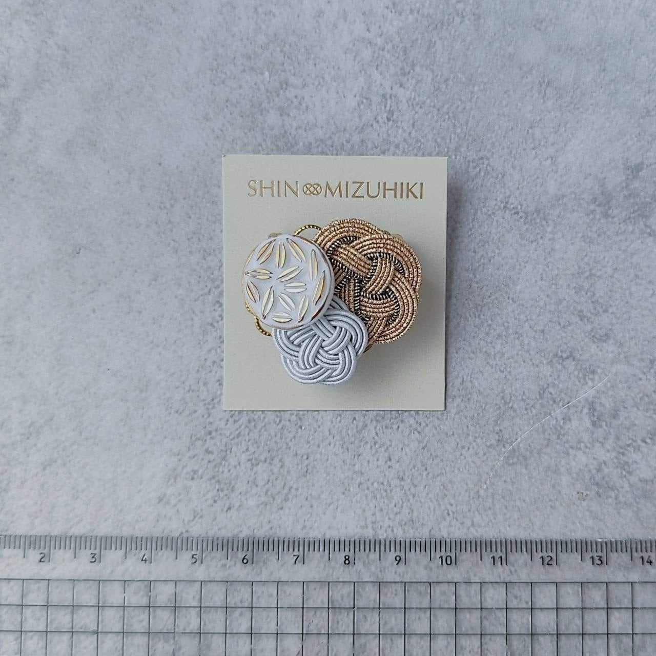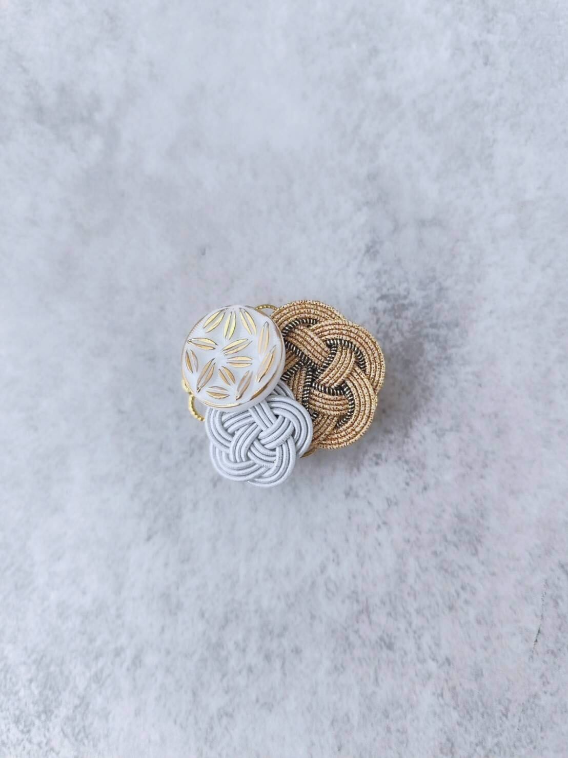 ③ ヴィンテージ帯留め / W梅白 ドイツヴィンテージガラスボタンと水引梅結びの帯留め