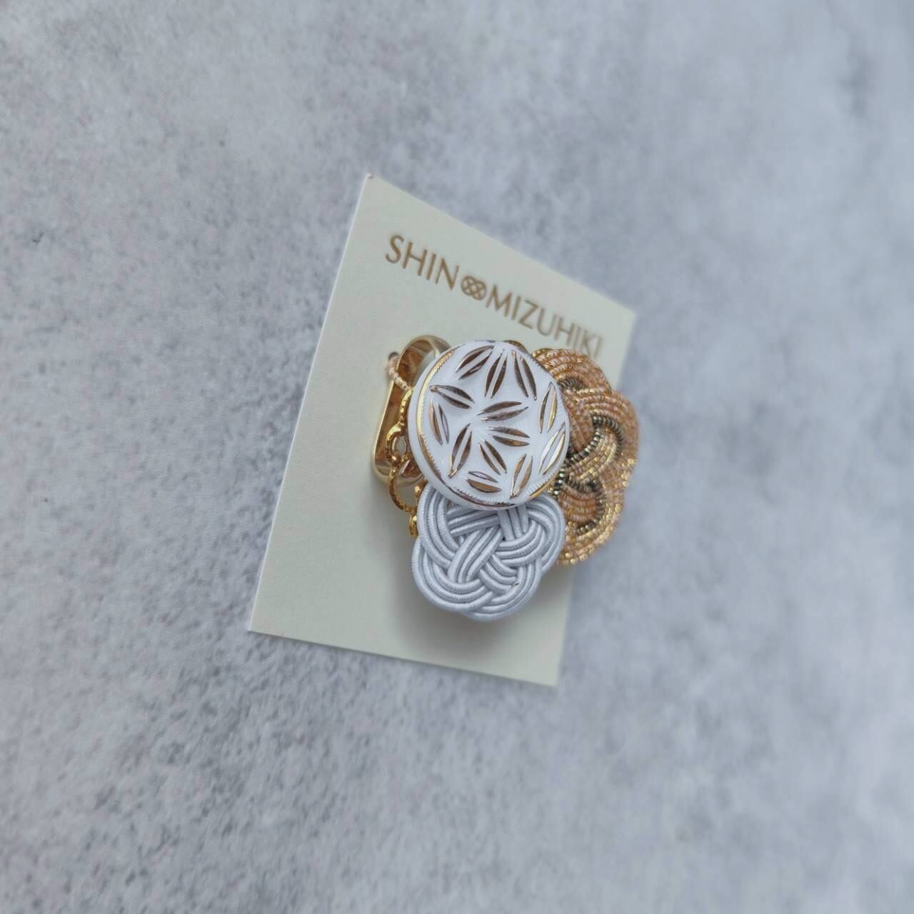白とゴールドの上品な配色が、凛とした気品とさりげない華やかさを添え、季節を問わず装いを引き立てます。