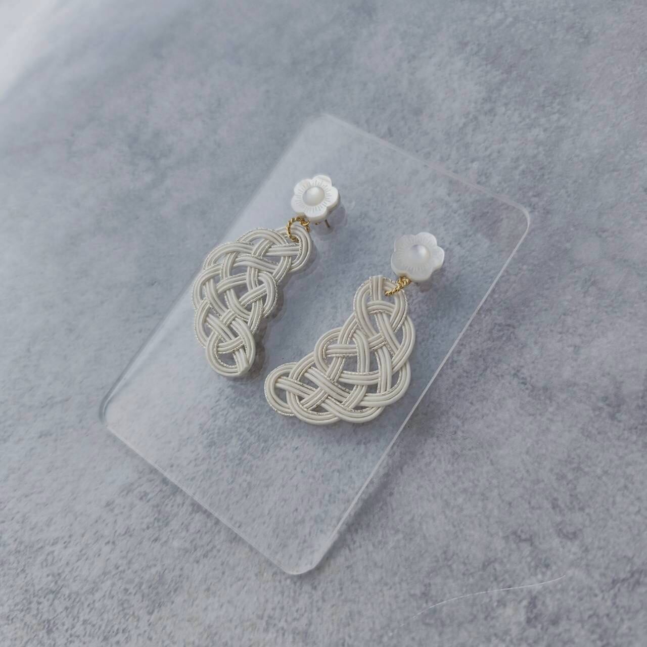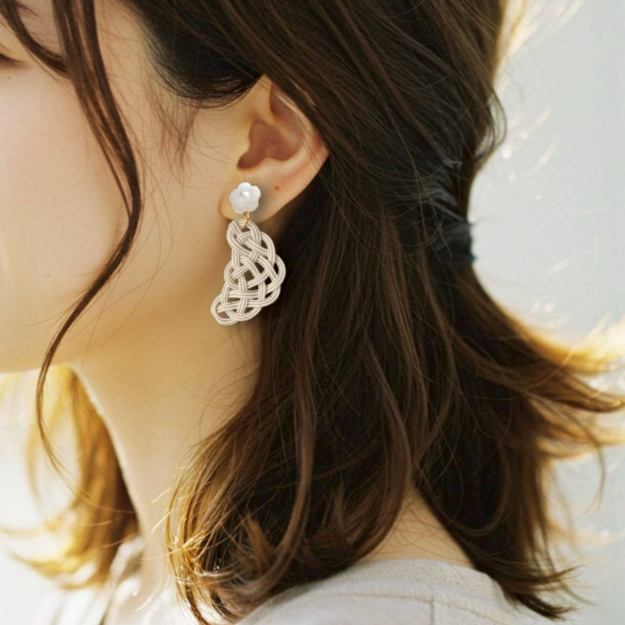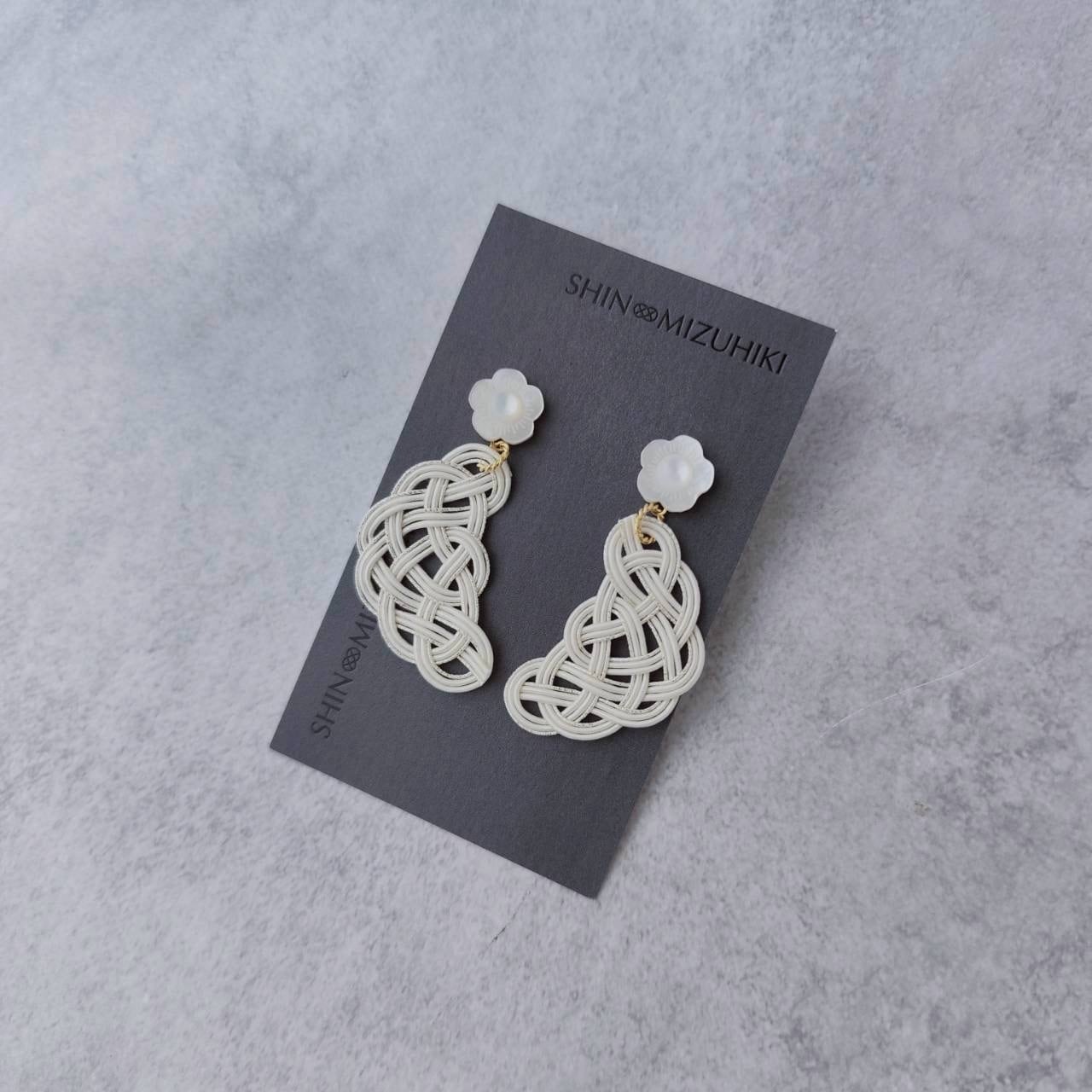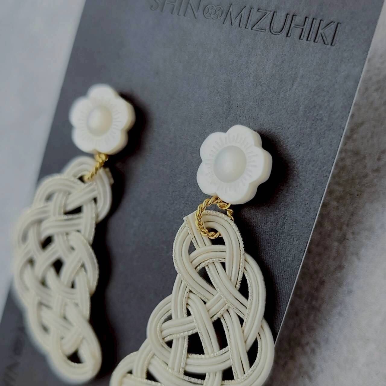 花の形をしたヴィンテージのシェルボタンに、水引「松結び」を合わせた、清らかで凛とした印象のピアスです。